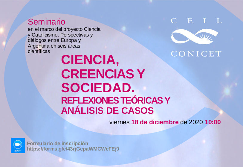 | Te invitamos a participar del Seminario Ciencia, creencias y sociedad. Reflexiones teóricas y análisis de casos. Este viernes 18/12 a las 10hs. por zoom. https://forms.gle/43rjGepaWMCWcFEj9 Programa: 10hs. Apertura.Gabriela Irrazábal (CEIL-CONICET) Presentación del Proyecto Ciencia y Catolicismo. Perspectivas y circuitos de diálogo entre Europa y Argentina en seis áreas científicas (Epistemología, Bioética, Genética, Medicina Reproductiva, Embriología, Psiquiatría and Neurociencias) financiado por la International Research Network for the Study of Science and Belief in Society (INSBS con sede en la Universidad de Birmingham y financiado por la Fundación Templeton) 10.15. Hs.Ciencia, creencias y sociedad. Perspectivas teóricas. La tesis del conflicto vs. la tesis de articulación.Dra. Ana Lucía Olmos Álvarez (UNDAV-CONICET) 10.45 Hs.Posesión demoníca y debates científico-religiosos. Psiquiatría, diagnóstico, demonios y salud mental.Dra. Verónica Giménez Béliveau (CEIL-CONICET) 11.15 hs.El concepto de potencialidad. Debates científico-religiosos en torno al estatuto del embrión humano.Dra. Cecilia Johnson (UNC CIECS-CONICET) 11.45 hs.Comunidades religioso-epistémicas. Más allá de la tesis del conflicto entre Ciencia y Religión.Dra. Gabriela Irrazábal (CEIL-CONICET) |