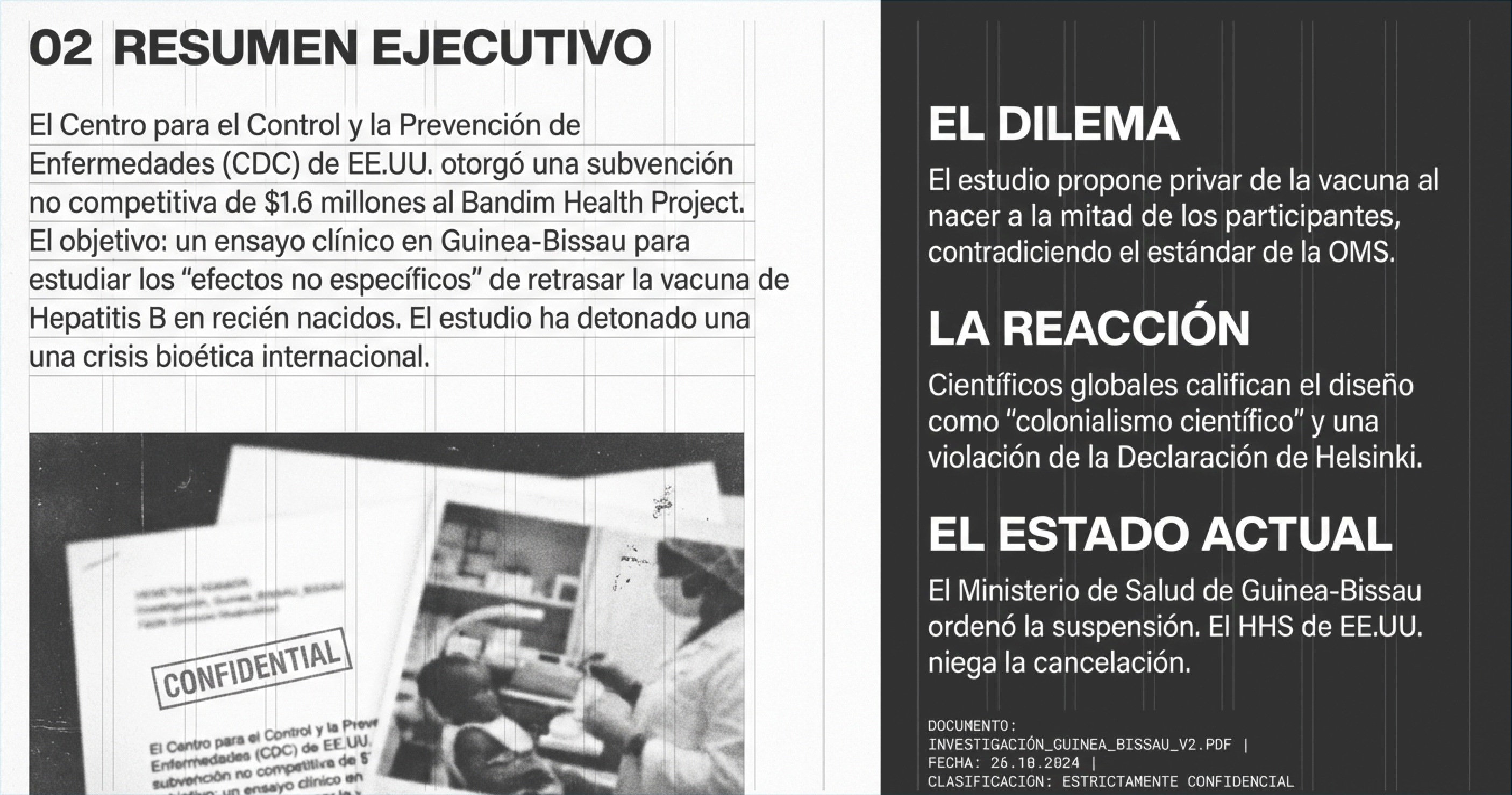 El diseño del estudio contempla asignar aleatoriamente a 7.000 recién nacidos para que no reciban la dosis de nacimiento de la vacuna contra la hepatitis B, retrasándola hasta las seis semanas de vida. Esto ocurre pese a que la Organización Mundial de la Salud (OMS) recomienda administrar esa dosis dentro de las primeras 24 horas para prevenir la transmisión. En un contexto donde en Guinea-Bissau casi una de cada cinco personas está infectada y el 90% de los bebés expuestos al nacer desarrollan una infección crónica, distintos expertos consideran riesgoso y poco ético negar una inmunización ya probada.